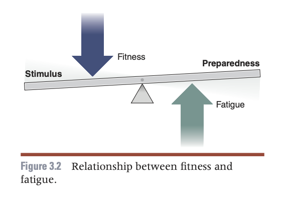 Si nous avons un graphe avec sur l’ordonnée le niveau de performance et sur l’abscisse le temps, l’entrainement représenterait une sinusoïde avec une courbes ascendantes et descendantes. La courbe descendante représente la fatigue induite par un stress subit durant l’entrainement et la courbe ascendante représente quant à elle le gain en performance induit par la récupération. Une charge d’entrainement adaptée sur une période donnée impliquera sur le graphe une droite croissante traduisant une augmentation de la performance à travers le temps. A l’inverse, un gros volume d’entrainement avec une intensité trop importante rendra cette sinusoïde plutôt décroissante traduisant une baisse de la performance à travers le temps.